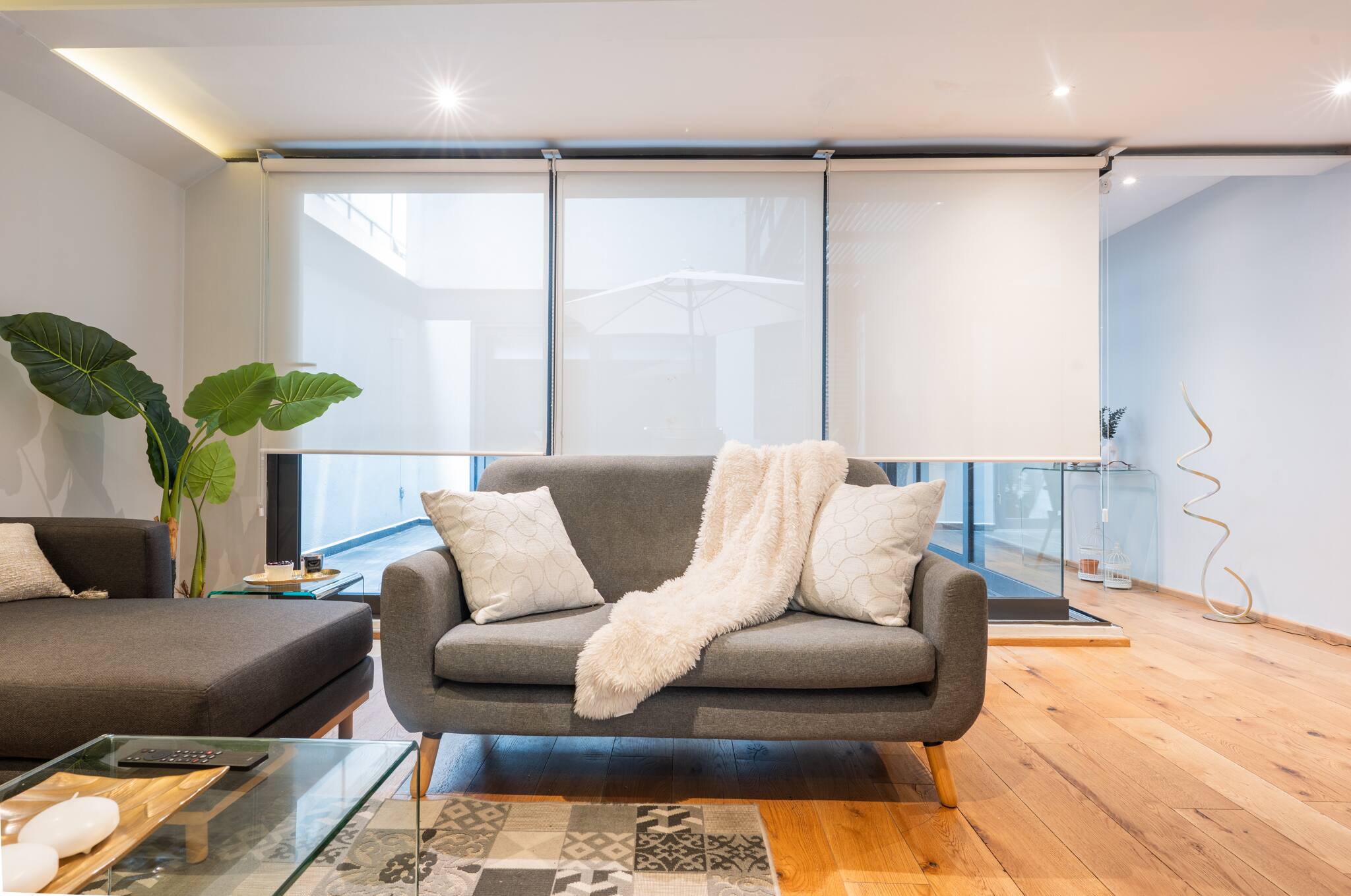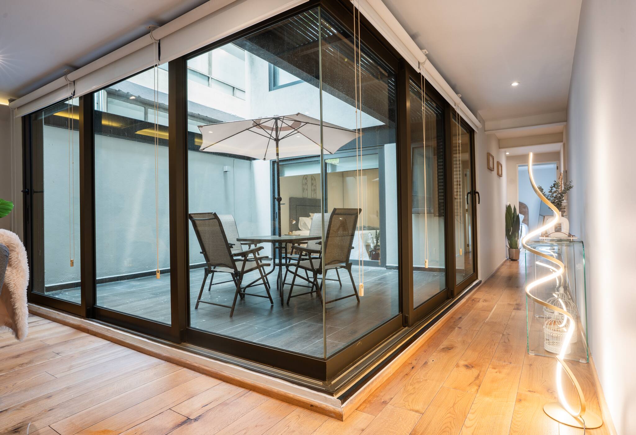 At the heart of the apartment, a stunning indoor terrace with floor-to-ceiling windows connects the living room, hallway, and one of the bedrooms, flooding the home with natural light.