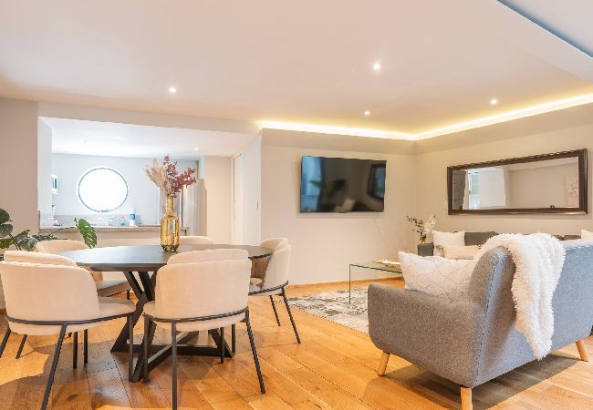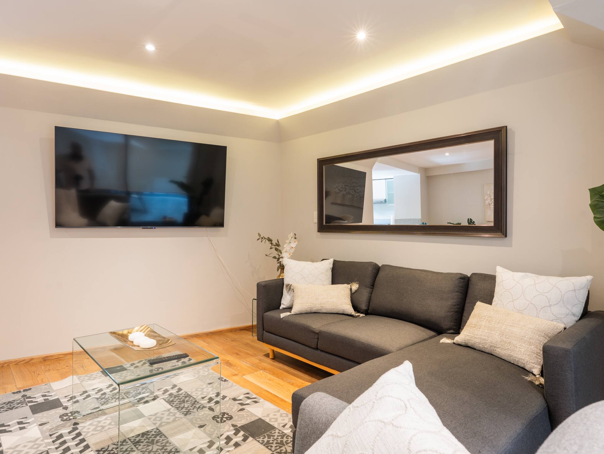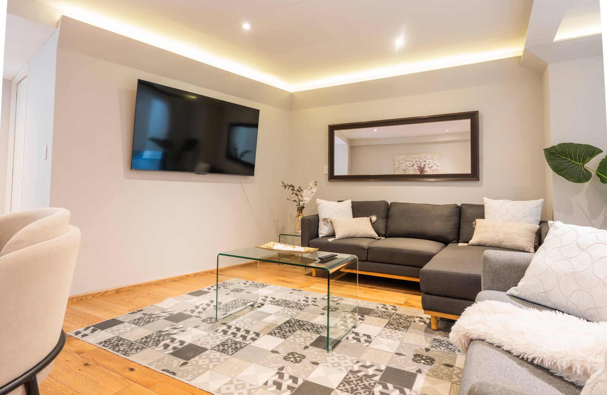 Step into a bright and beautifully designed living room featuring a large smart TV and a comfortable sofa, ideal for relaxing after a day of exploring. The round dining table sits close to the fully equipped open kitchen, perfect for home-cooked meals.