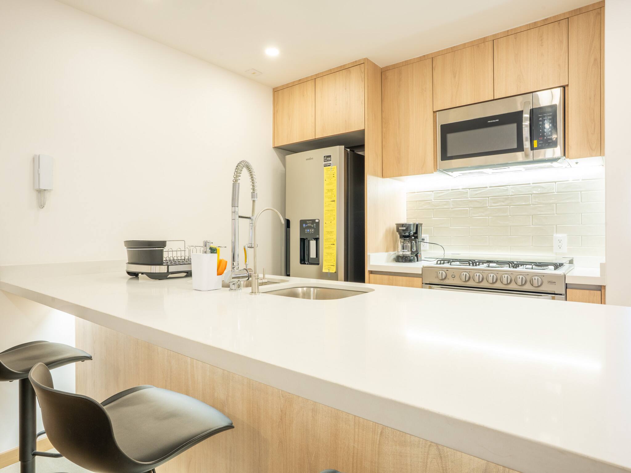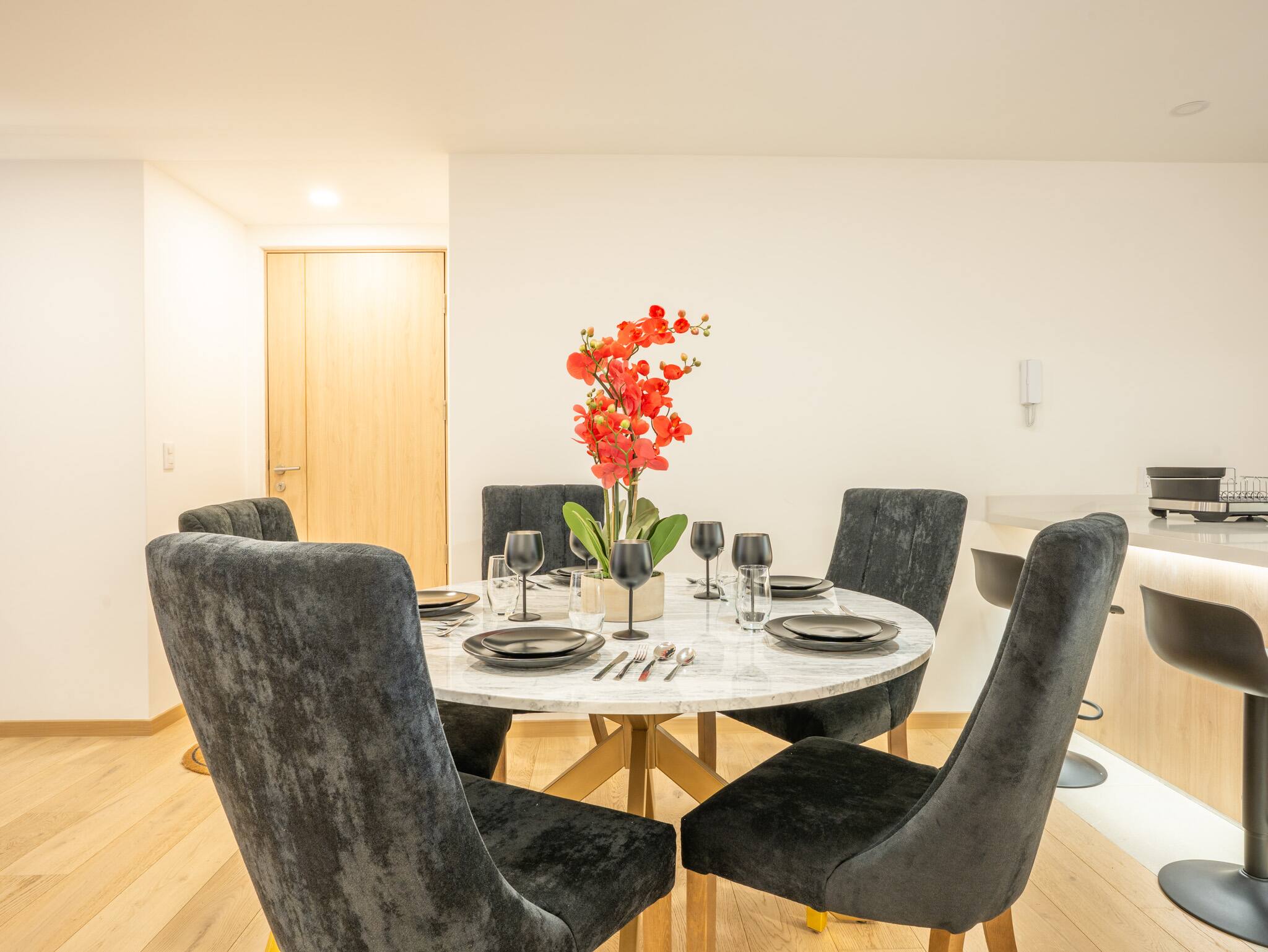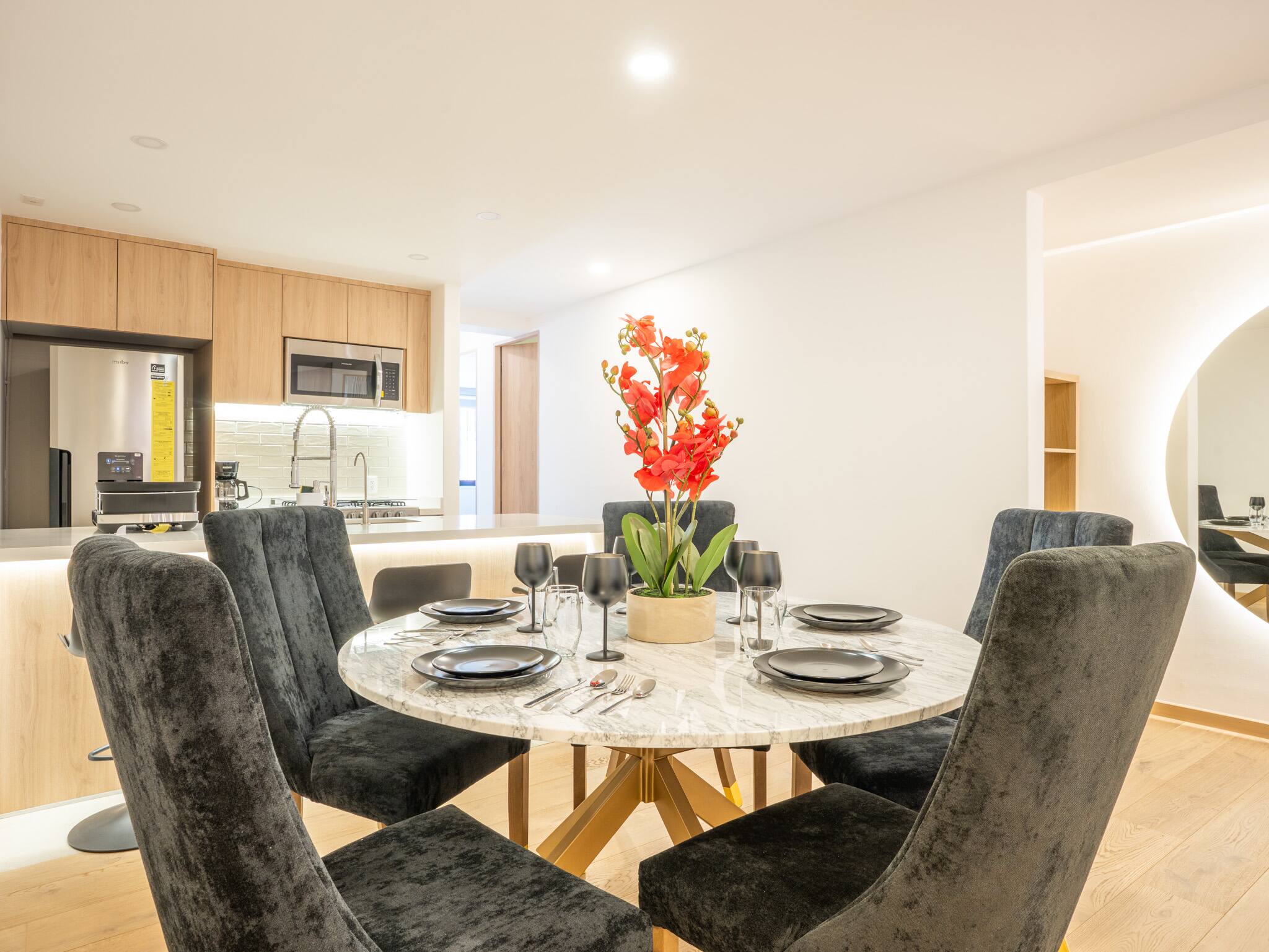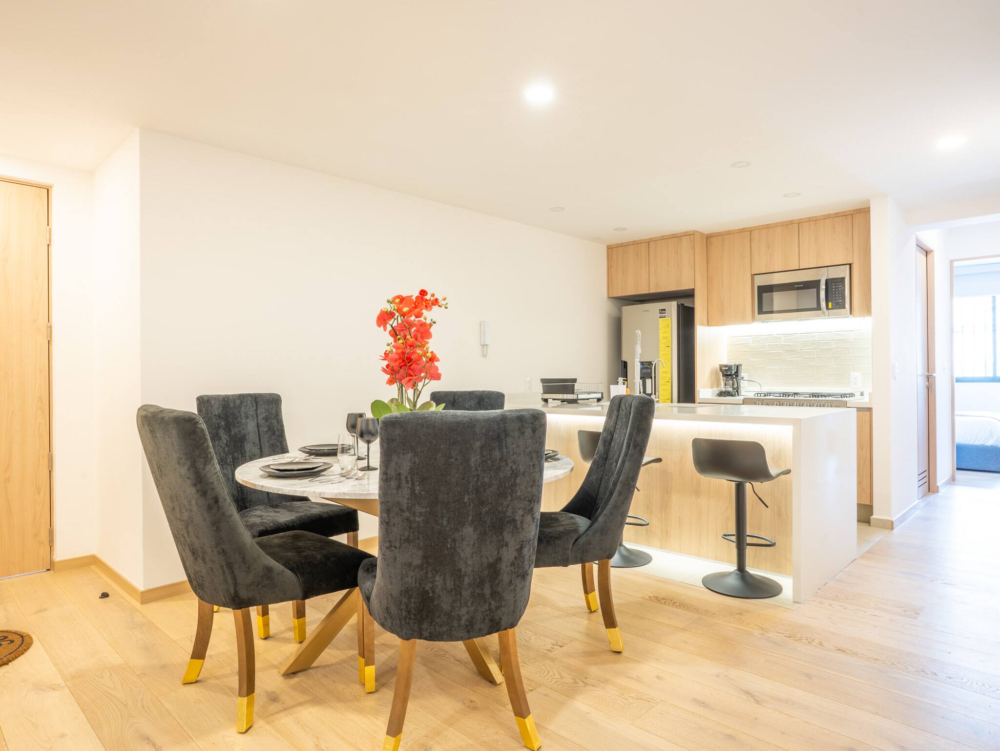 The American kitchen is fully equipped with state-of-the-art appliances, including a gas stove, refrigerator, washing machine, dryer, coffee maker, oven, microwave, and all the necessary utensils to prepare delicious meals. In addition, it has a dining table perfect for sharing special moments.