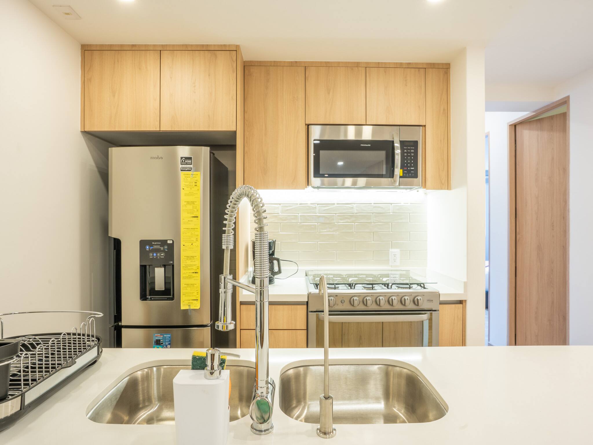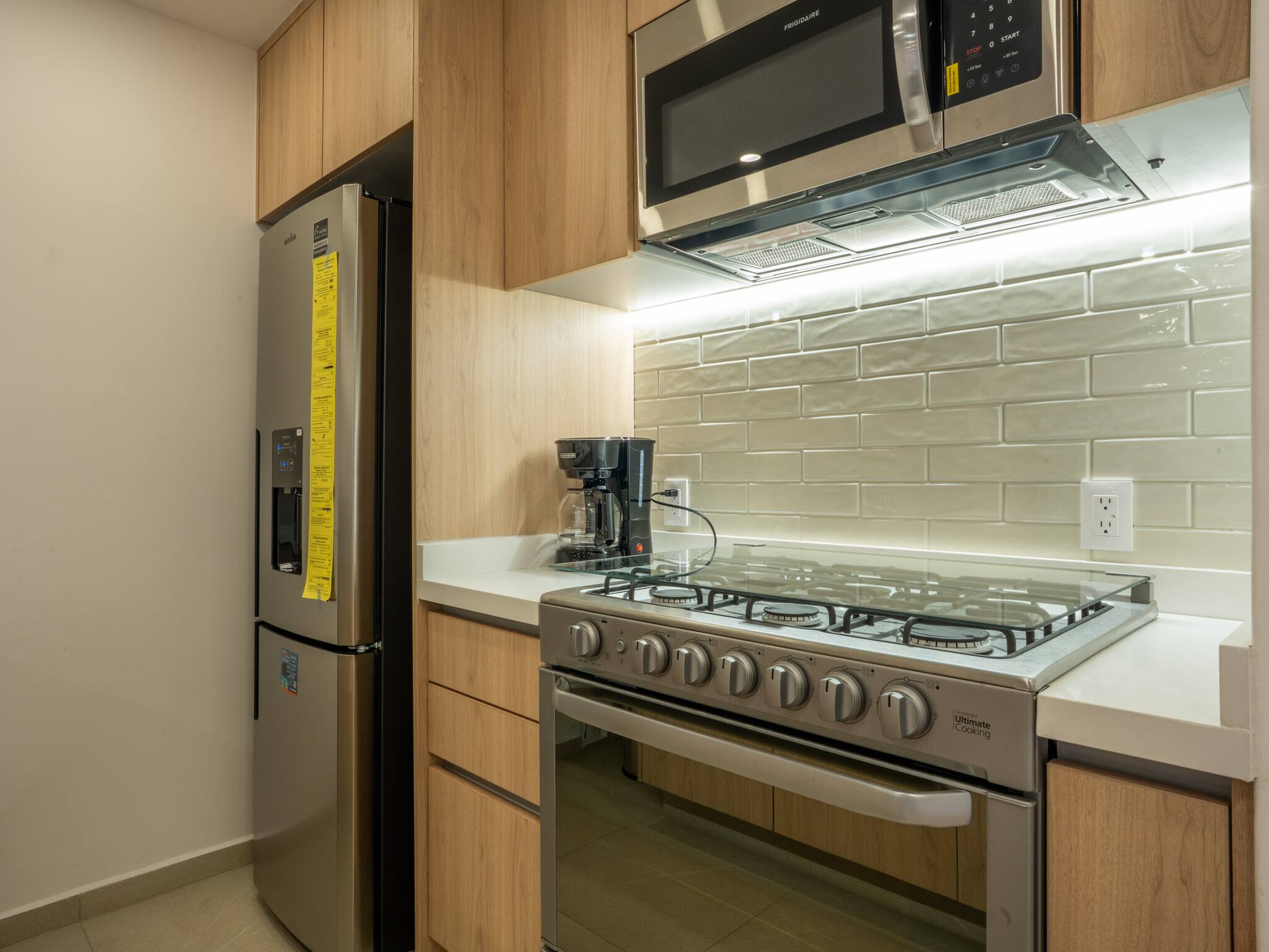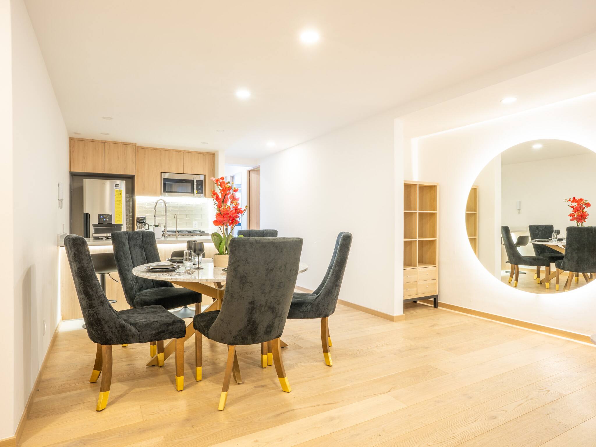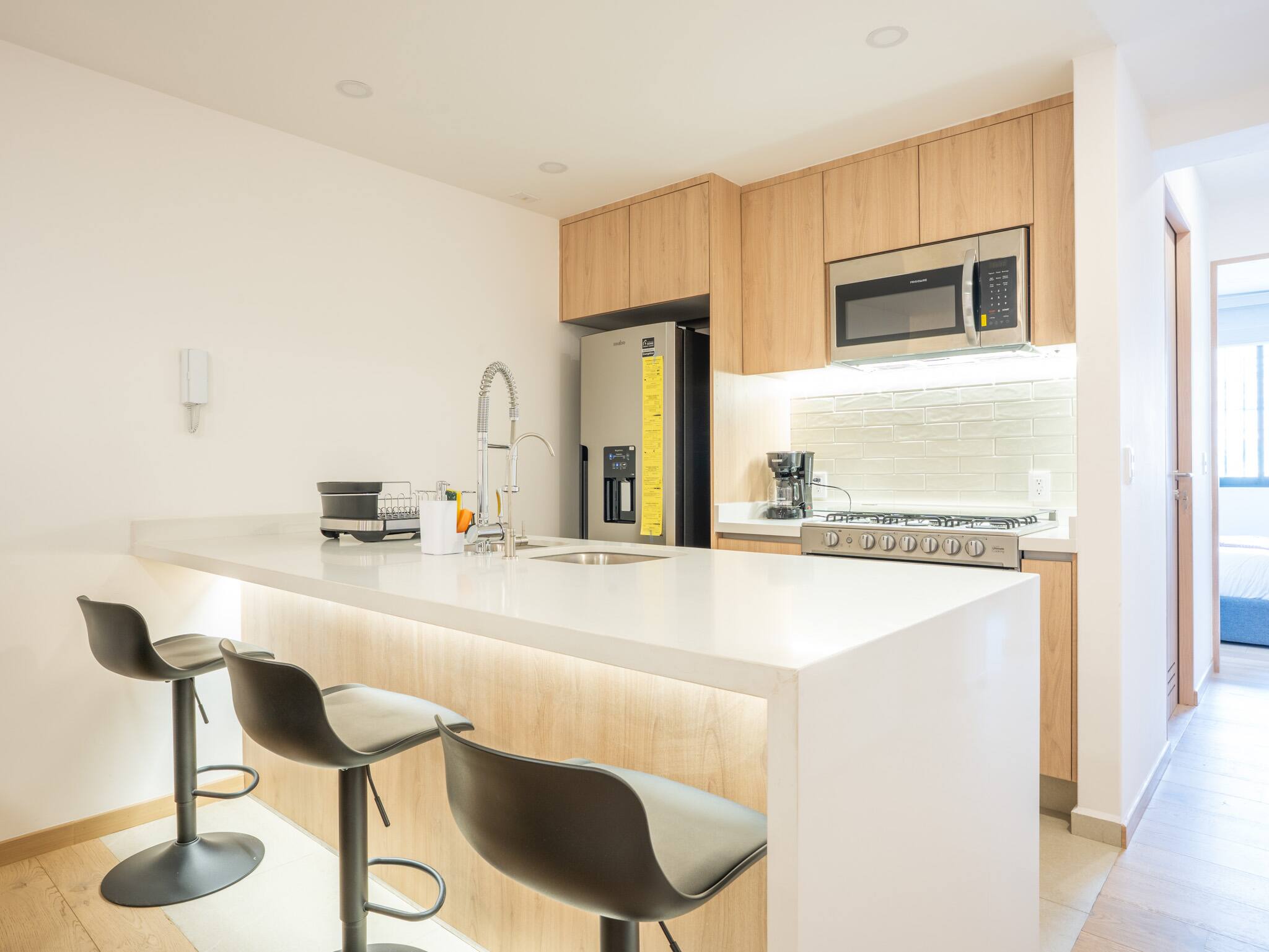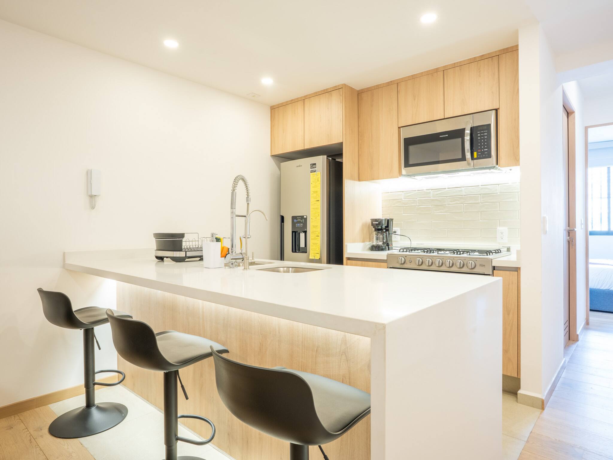 The American kitchen is fully equipped with state-of-the-art appliances, including a gas stove, refrigerator, washing machine, dryer, coffee maker, oven, microwave, and all the necessary utensils to prepare delicious meals. In addition, it has a dining table perfect for sharing special moments.