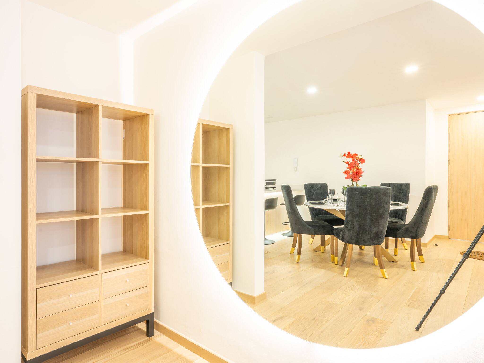 As you enter the apartment, you are welcomed by a bright and inviting living room, complete with a comfortable sofa and a large dining table—perfect for shared meals or gatherings. The open kitchen is fully equipped and seamlessly connected to the living area, creating a social and functional space. There is also a separate laundry room for added convenience with a washer.