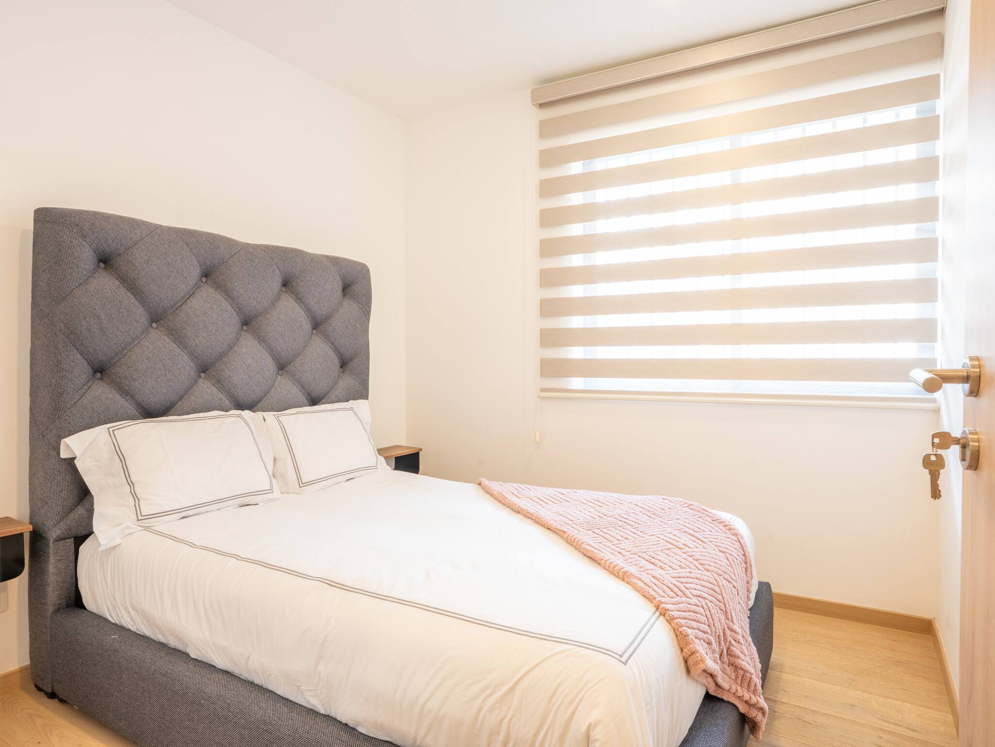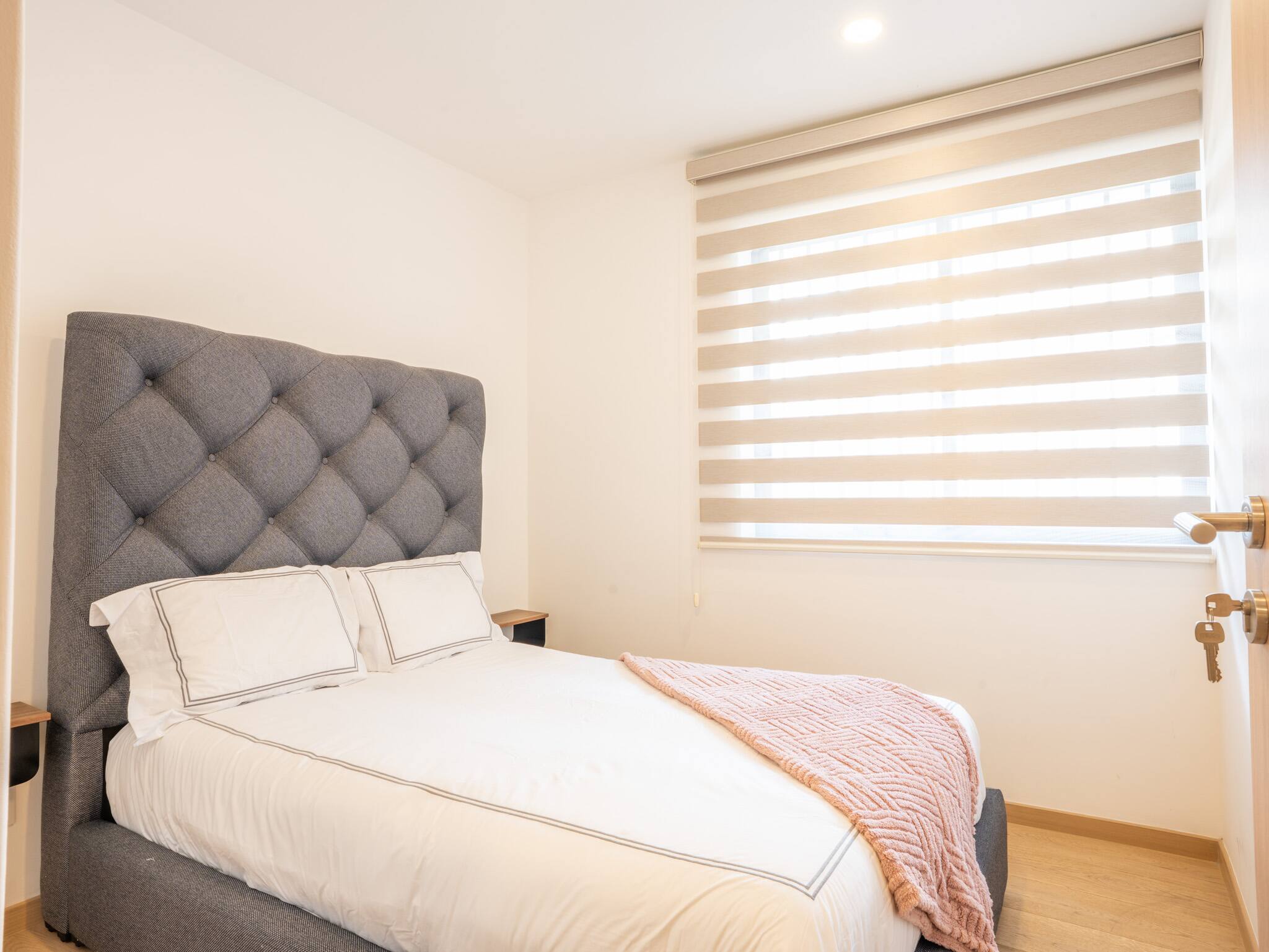 The apartment features three spacious bedrooms, each equipped with plush beds and high-quality linens to ensure a restful night's sleep.