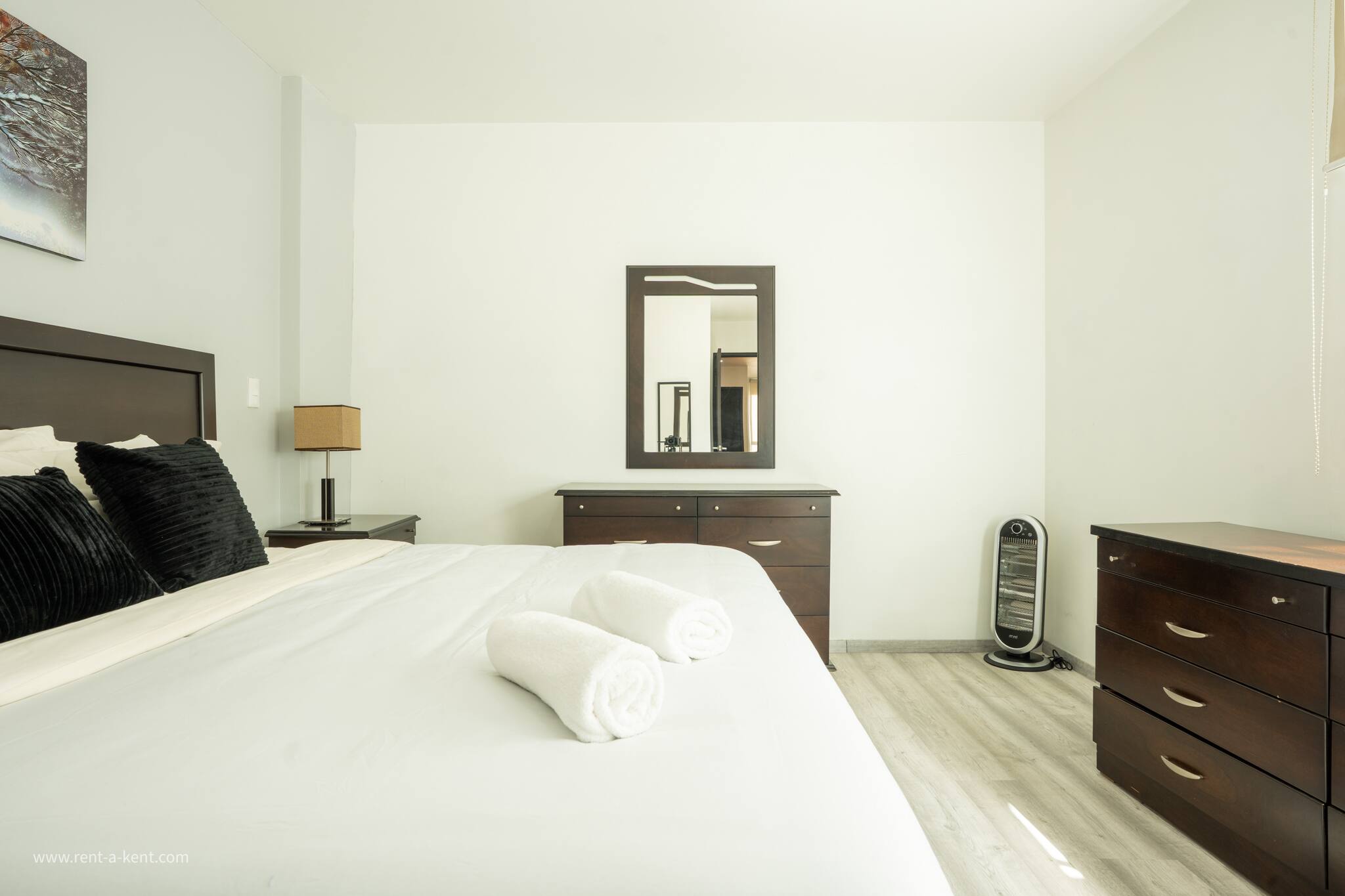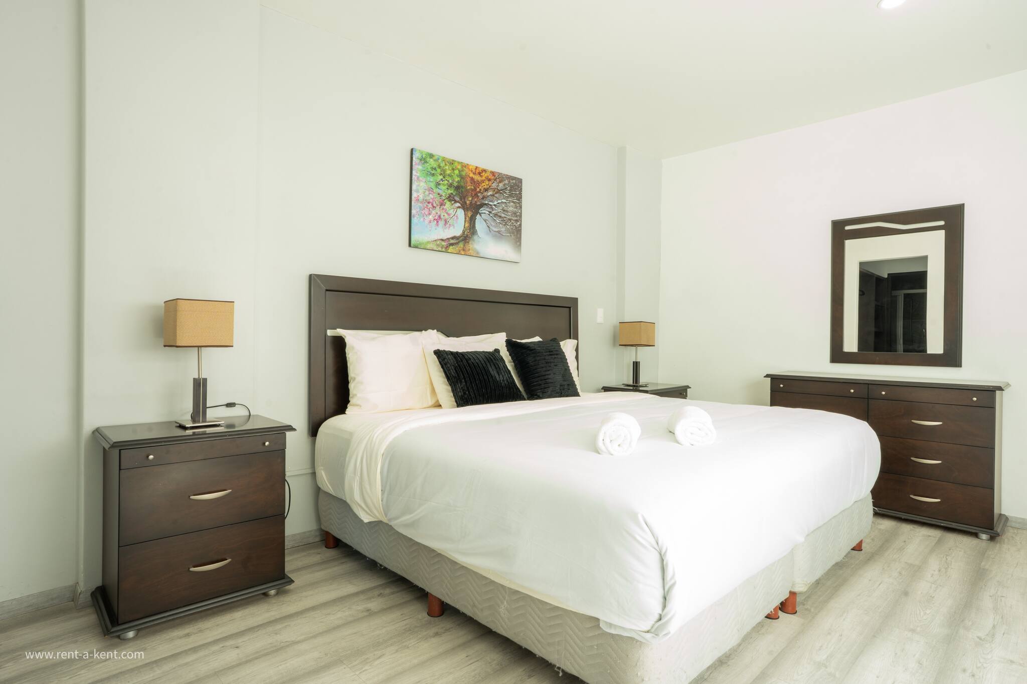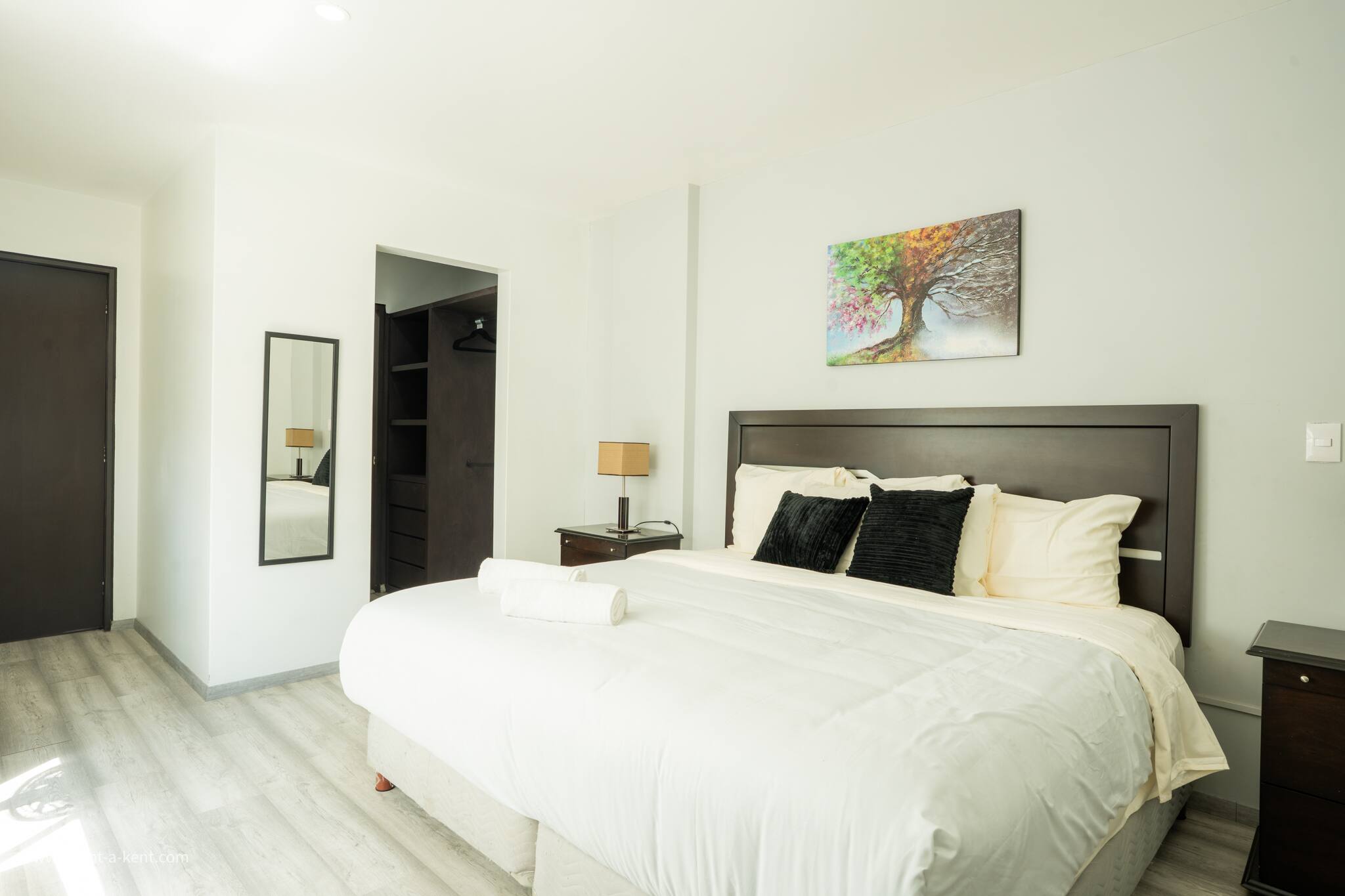 1. The master bedroom has a king bed, a walk-in closet, and a private en-suite bathroom