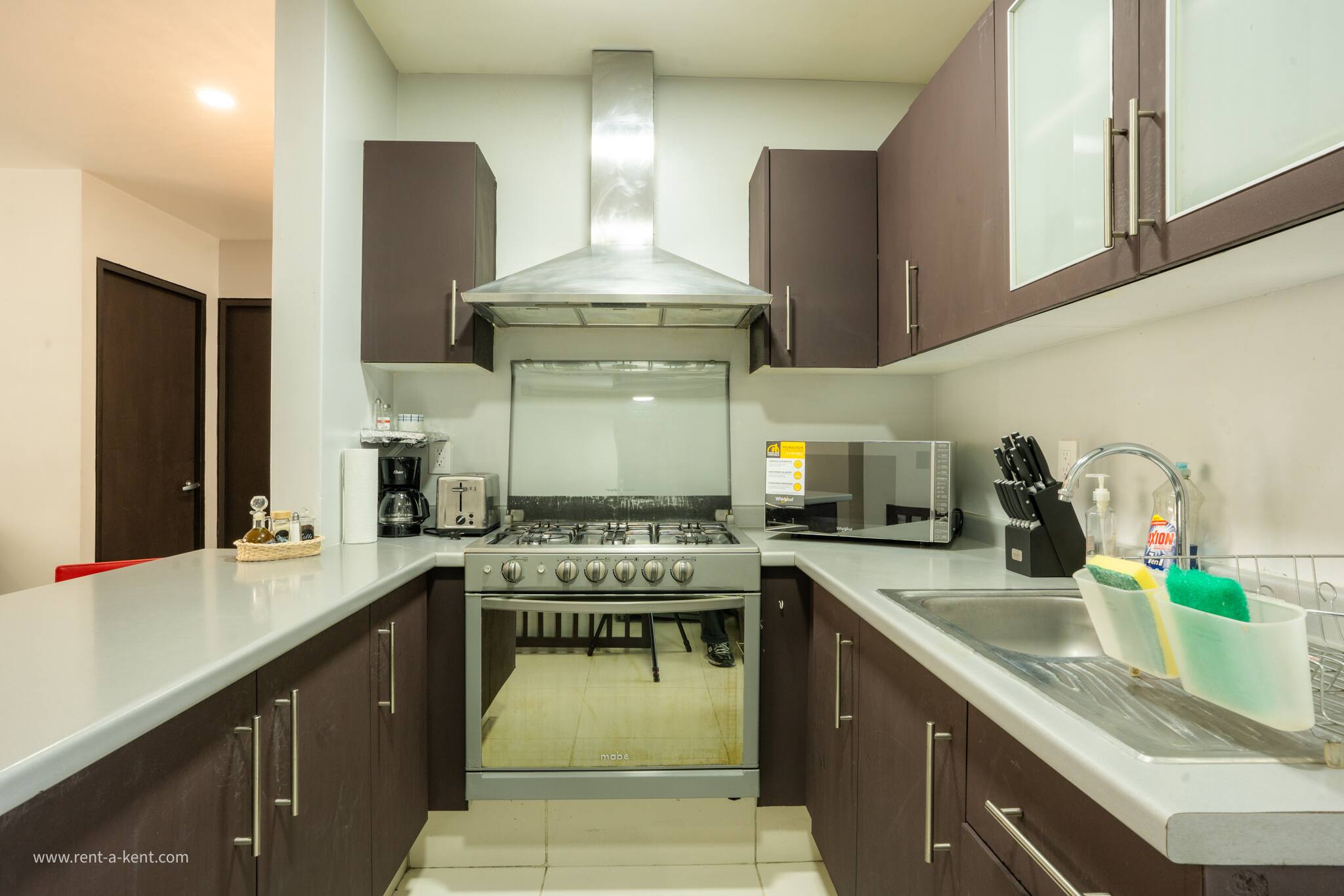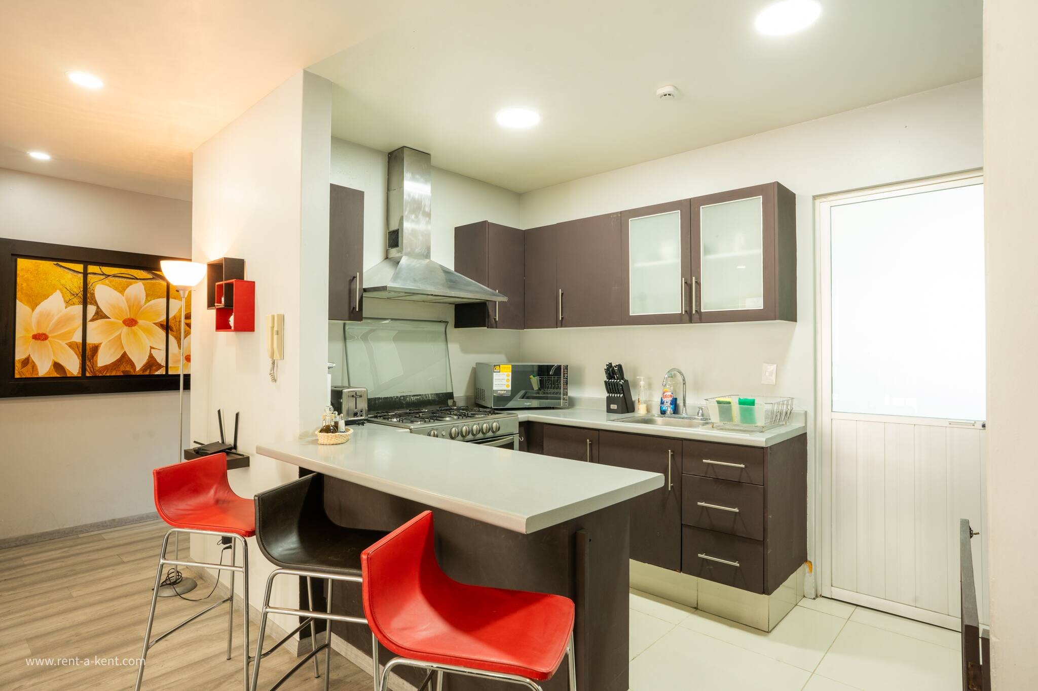The American kitchen is fully equipped with state-of-the-art appliances, including a gas stove, refrigerator, washing machine, dryer, coffee maker, oven, microwave, and all the necessary utensils to prepare delicious meals. In addition, it has a dining table perfect for sharing special moments.