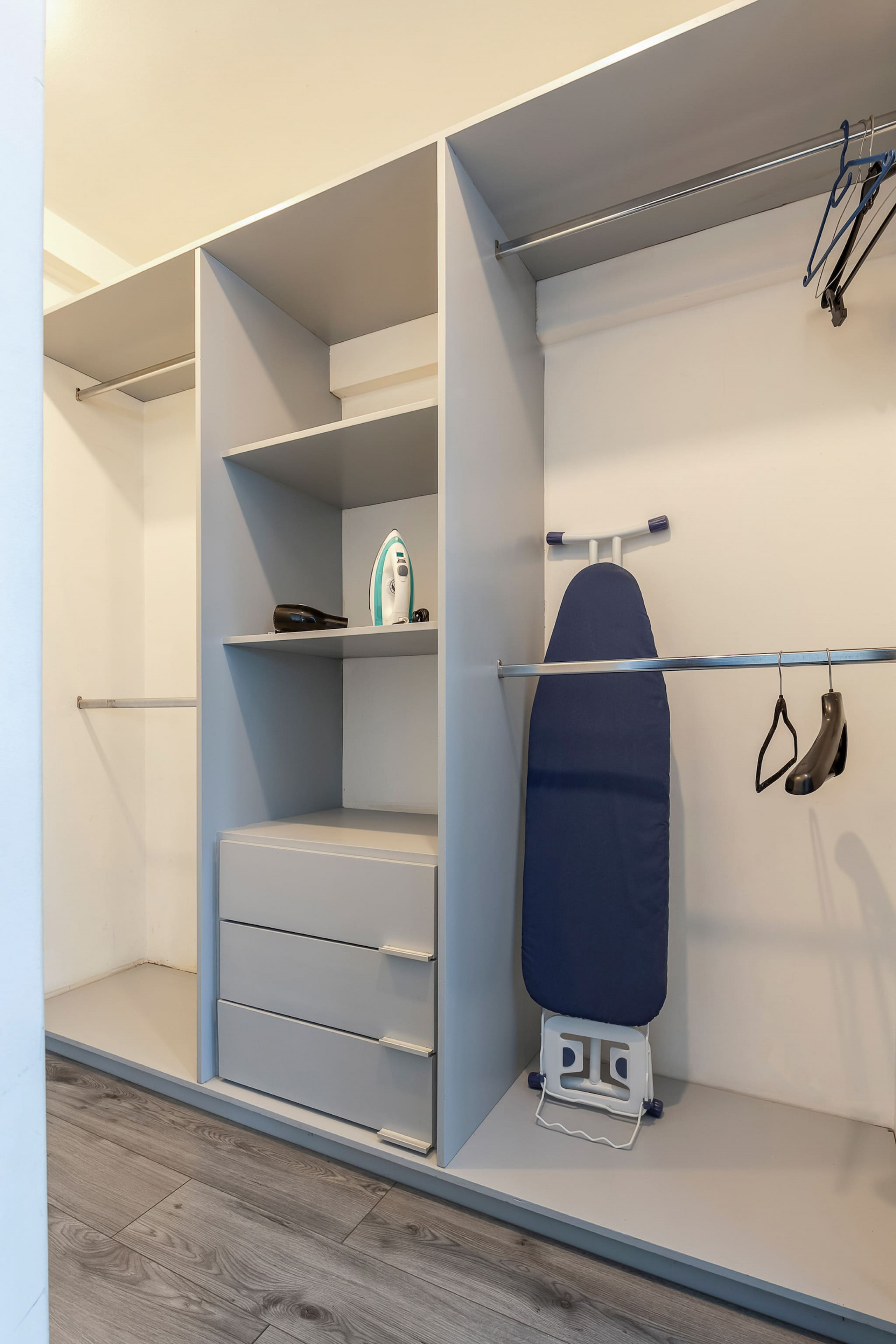 The apartment features one spacious bedroom with a king-size bed and a full walk-in closet conveniently located right outside the master bedroom. The living room includes a sofa bed, perfect for accommodating an additional guest. Both the bedroom and the living room are equipped with TVs, and the space also offers a comfortable workstation for remote work.