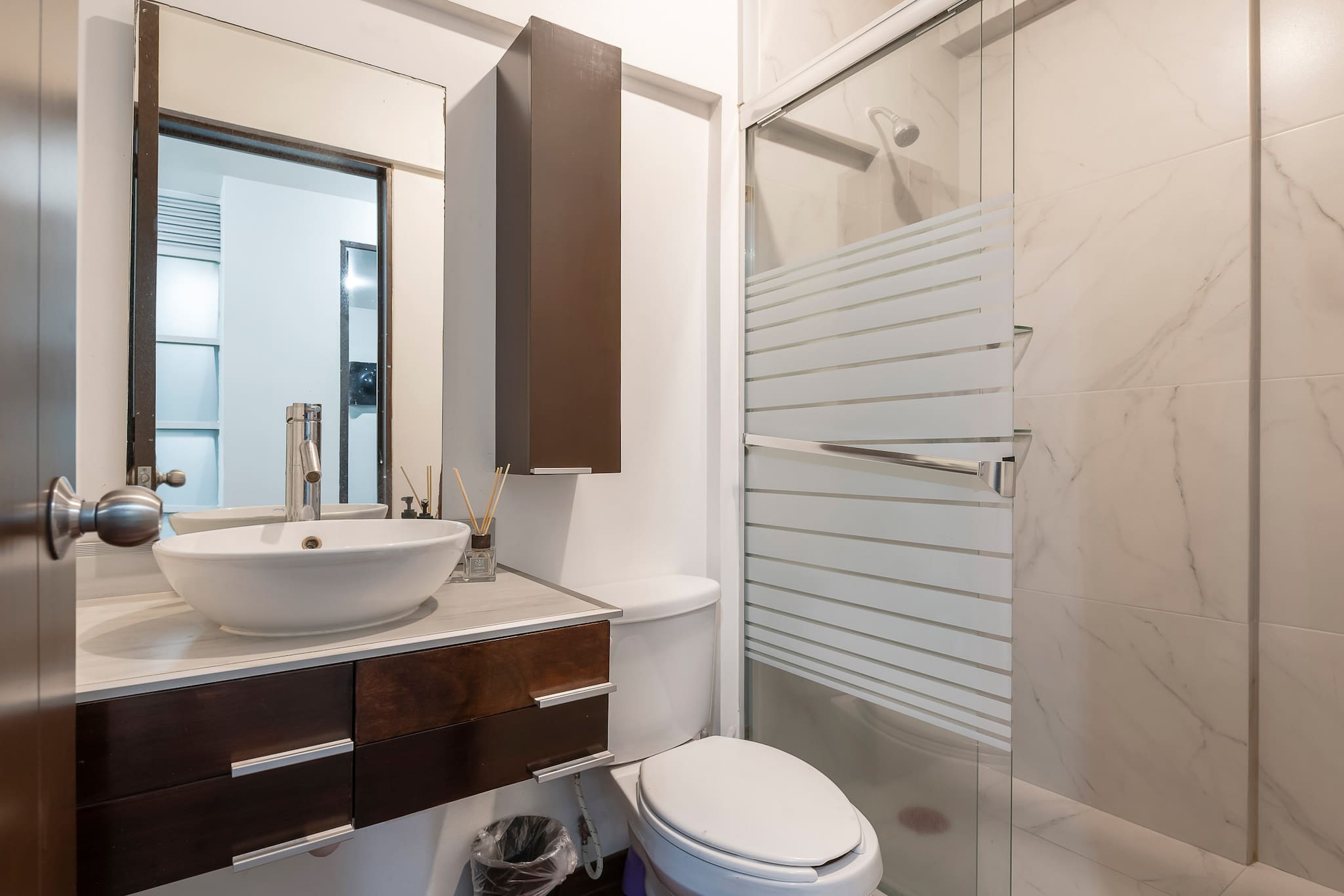 This modern apartment features two elegantly equipped bedrooms: one with a king-size bed and another with a queen-size bed, ideal for a maximum of 4 guests. Enjoy two full bathrooms with shower, providing comfort and privacy during your stay.